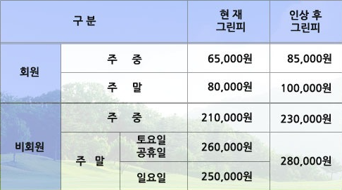 뉴코리아cc 그린피 인상 안내 페이지 정보 작성자 동부회원권거래소 작성일22-09-07 16:56 조회17,921회 댓글0건 관련링크 목록 본문 뉴코리아cc 그린피 인상 안내인상대상 : 회원 및 비회원인상시기 : 2022년 9월 1일부터 목록
